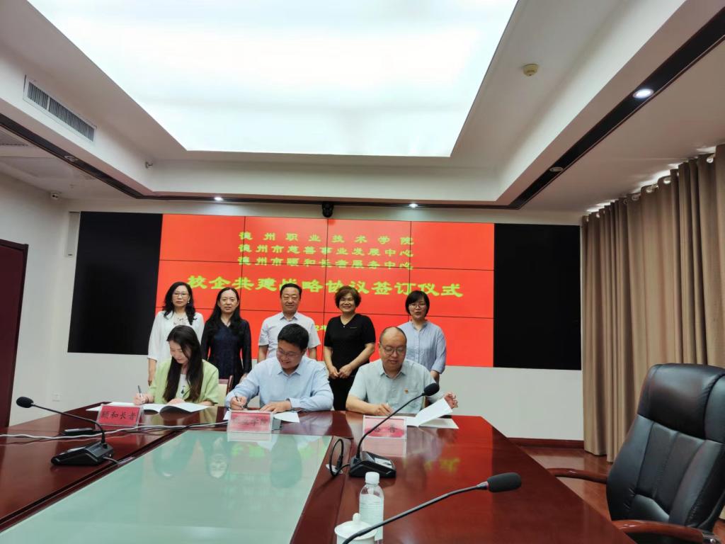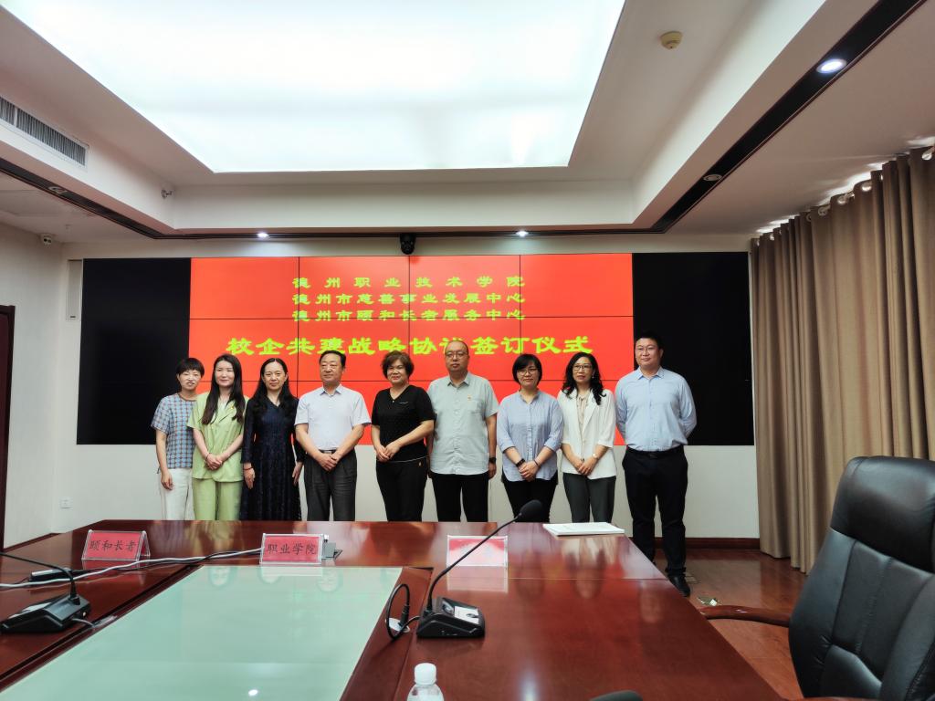 6月14日上午,德州职业技术学院、德州市慈善事业发展中心、德州市颐和长者服务中心战略合作签约仪式在民政事业园七楼会议室举行。校党委委员、工会主席周爱红,民政局副局长张宝明、德州市慈善事业发展中心主任焦焱、德州市颐和长者服务中心主任张爱霜及健康管理学院相关人员参加了签约仪式。