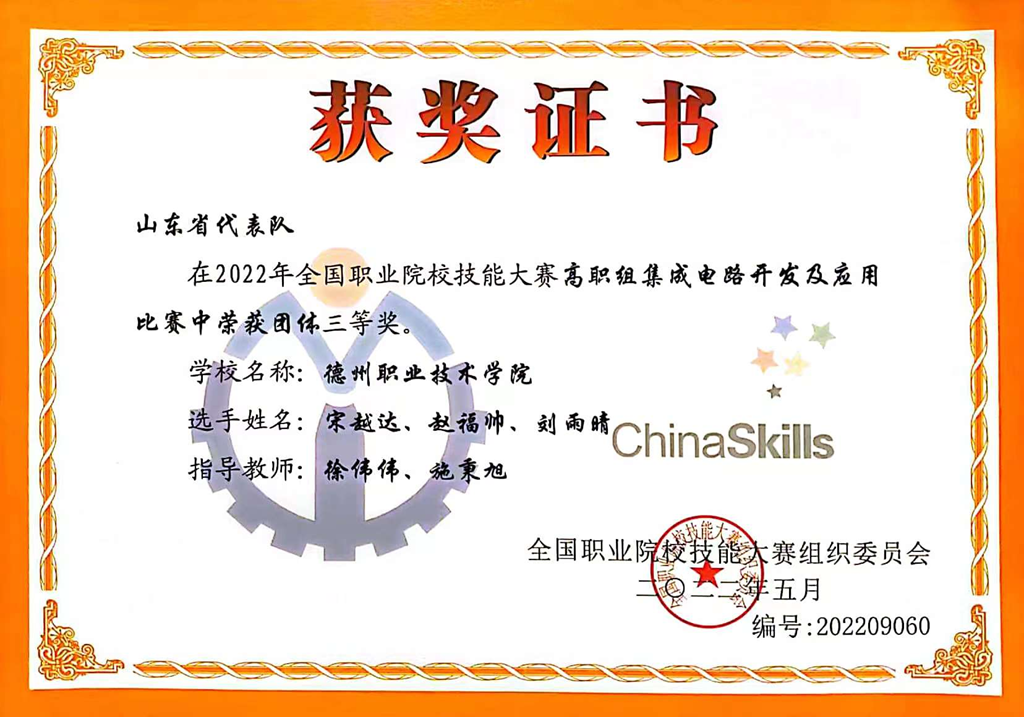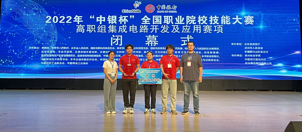 2022年全国职业院校技能大赛高职组“集成电路开发及应用”赛项,于8月31日在滨州职业学院落下帷幕,德州职业技术学院电子与新能源技术工程系参赛队员宋越达、赵福帅、刘雨晴在指导教师徐伟伟、施秉旭、李修丞的指导下荣获三等奖,实现了本赛项在国赛奖牌中零的突破。