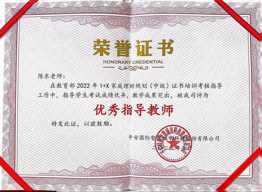 我校获评1+X家庭理财规划(中级)证书考核优秀试点院校。在教育部2022年1+X家庭理财规划(中级)证书培训考核工作中,经济管理系张冬冬、李莎、陈东三位老师在疫情管控的大环境下,带领2021级金融管理专业30名学生,在课余时间通过线上线下结合的方式进行学习训练。最终全员通过考核,均获得1+X家庭理财规划(中级)证书。陈东老师被评为优秀指导教师,我校被评为优秀试点院校。