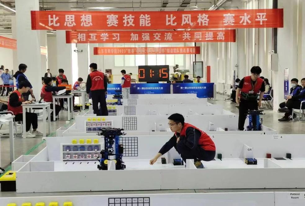山东省职业技能大赛由山东省人民政府主办,此次“移动机器人”赛项对接世界技能大赛,参照世界技能大赛参赛标准共分为4个模块,分别从职业素养、机器人硬件拆装、接线、编程及调试等方面考察选手的技能和素养。比赛过程中,两名参赛选手沉着冷静、有条不紊,表现出了较好的职业能力和职业素养。