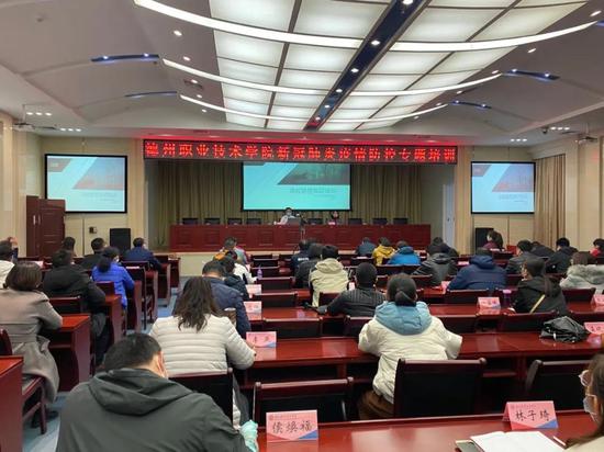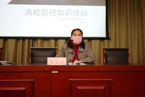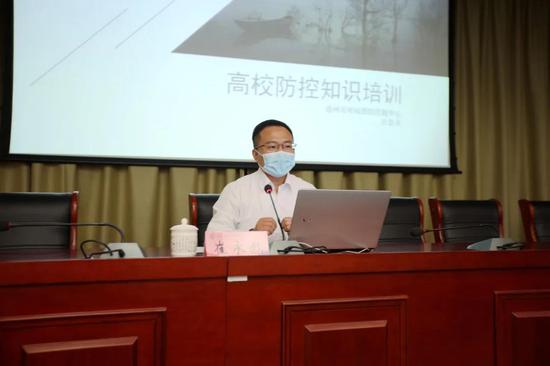 为进一步提高我校新冠肺炎疫情防控的知识和技能水平,做好开学准备工作,保障全校师生员工生命安全和身体健康,4月9日,德州职业技术学院特别邀请德州市疾控中心专家崔永彪来校,针对新冠肺炎疫情防控知识和学校开学前后防控管理工作做专题培训和指导。党委副书记、工会主席张恒斌,学生处、保卫处、后勤处、医务室等相关工作人员,各单位教职工健康联络员,各系部学生科长、辅导员参加了此次培训活动。党委委员、组织人事处处长周爱红主持培训活动。