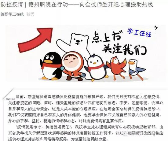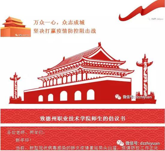 发布致学校师生的倡议书,引导广大师生提高认识,严肃对待疫情,服从防疫大局;提醒师生遵守纪律,严格按照教育部、省教育厅、市教育工委延迟开学的要求,不提前返校;传授科学应对的方法,引导师生不去人员密集的场所,出门佩戴口罩,养成良好的生活习惯;牢牢把握意识形态领域的主导权,弘扬正能量、唱响主旋律,坚定师生的信心,引导师生理性思考,不信谣、不传谣;开展亲情教育,引导师生提高家人的防范意识,引导师生利用宝贵的时间静心提升自己;号召师生响应党和国家的召唤,勇于承担社会责任,为国家、山东省、德州市疫情防控贡献德职力量。
