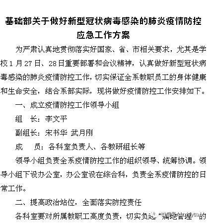 学校成立了以党委书记、院长为组长,分管校领导为副组长,各行政处室、系(部)党政主要负责同志为组员的疫情防控工作领导小组,先后召开3次疫情防控领导小组会议,传达上级有关文件精神,统一思想,认真分析研判学校疫情防控形势,部署启动防控工作。制定印发了加强联防联控做好疫情防控工作的一系列通知文件,编制应急预案,层层压实责任,学校疫情防控工作全面有序铺开。