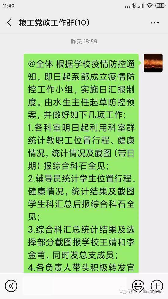 充分发挥校园网、微信公众号、微博、校园智能化系统等主阵地作用,转发官方权威途径获取的信息,全方位宣传防疫知识,做好师生的思想工作,增强了师生应对疫情的能力。广大师生认真学习、积极配合,三名教职工因孩子在武汉高校就读,主动联系居委会和物业,进行自我隔离。
