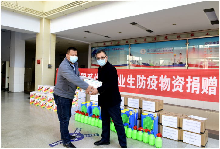侯爱军、杨东凯、汪颜哲三名校友,毕业后均选择自主创业,创办公司,得知学校防控物资紧缺后,积极与原班主任联系,并回校捐赠物资,他们共捐赠消毒液50箱, 背式喷雾器10台,手持喷雾器20个,助力母校疫情防控工作。
