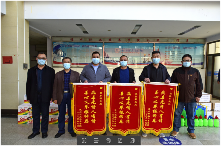 陈章侠表示,在抗击新冠肺炎疫情防控的关键时期,三名同学向学校捐赠防疫物资的善举,体现了对母校的关心与热爱,也体现了我校学子强烈的社会责任担当意识。是我校人才培养模式的缩影,充分体现了德州职院道德教育的丰硕成果。在这个特殊时期,学校将在校党委的坚强领导下,在广大校友的大力支持下,凝心聚力,持续完善防控措施,坚决打赢疫情防控阻击战。