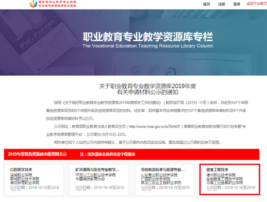2019年10月16日,教育部职业教育与成人教育司高职发展处对2019年度职业教育专业教育资源库申请材料进行了公示,德州职业技术学院粮食工程技术专业教学资源库申报材料通过了教育部初审。