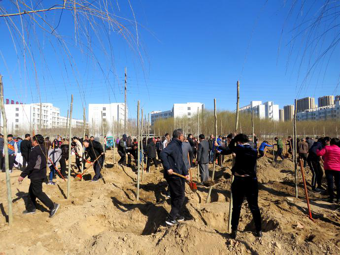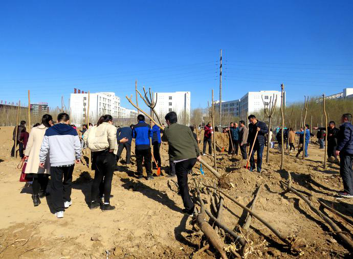 植树现场,党委书记樊兆杰、院长张同光等院领导率先垂范,教职工紧随其后,手拿铁锹,肩扛树苗,挥锹挖土,移栽种植,一起动手绿化自己的家园。大家三五成群,相互协作,从挖坑整地,栽植树苗,到扶正压实,各道工序一丝不苟,整个植树现场呈现一派热火朝天的劳动景象。随着一道道工序有条不紊地完成,一棵棵新苗就稳稳地在土里扎下了根。白腊、国槐、香花槐、法桐……短短一个小时,教职工新栽树苗近800株,为学校校园又新添了一抹亮丽的新绿。