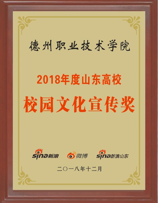 近日,新浪网2018年度山东教育新媒体宣传奖项榜单盛大发布,德州职业技术学院荣获“2018年度山东高校校园文化宣传奖”。