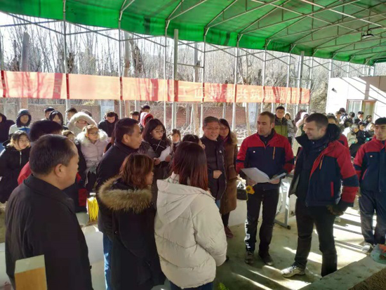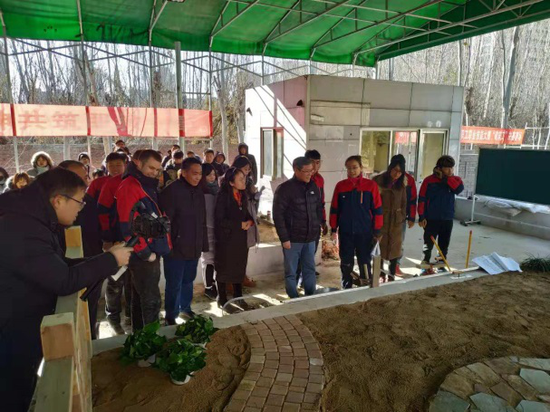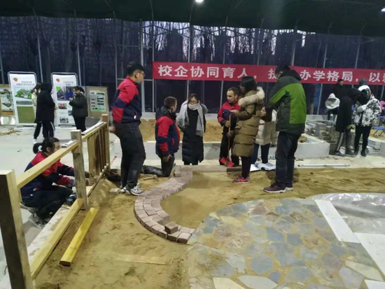 2018年12月7日,正值中国农历二十四节气中的大雪,德州的气温逼近零下十度,但并没有阻隔世界技能大赛园艺项目室外训练的热情。上午十点半,院长张同光、办公室主任郭士武在建筑园林工程系主任王刚的陪同下,亲临园林工程技术专业技能大赛训练场,对中法两校赛项训练指导老师表示慰问并亲切交流。法国福兰昂热职业高中老师Pierre Alban Sonnet(皮埃尔·奥尔本·索内)和Jean Baptiste Mauboussin(让·巴蒂斯特·蒙布索)向在场的学校领导介绍了本次训练的时间安排、作品特点以及弧形驳岸、条石汀步、碎拼铺装等细节布置,随后张院长参观了法国老师及指导的德州职业技术学院学生的园艺作品。
