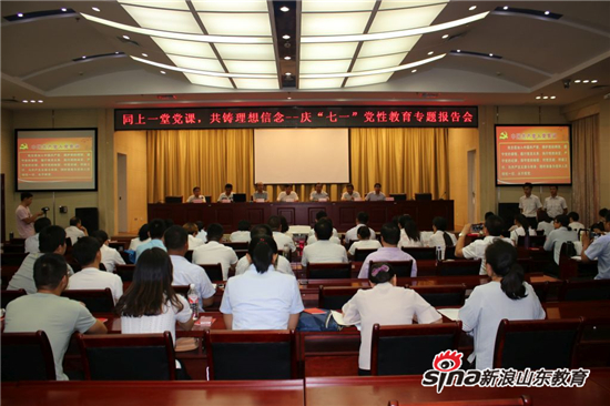 7月1日上午,为庆祝党的生日,德州职业技术学院远程教育培训中心党总支在学校二层报告厅举行题为“同上一堂党课,共铸理想信念”的党性教育专题报告会,特别邀请德州市委党校省高校思想政治理论课特聘教授时圣玉同志做关于学习党章的辅导报告,参加会议的有远程教育培训中心党总支全体党员以及2016、2017级电大基层干部直属班全体学员共计100余人,报告会由远教中心党总支书记姚振锁主持。