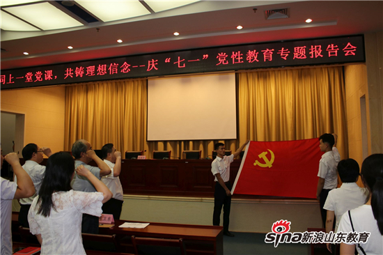 报告会在高亢嘹亮的国歌声中开始,在座的全体党员举起右臂,握紧拳头,面对党旗,重温入党誓词,“我志愿加入中国共产党,拥护党的纲领,……永不叛党。”铮铮誓言,发自肺腑,掷地有声,在报告厅萦绕回荡。