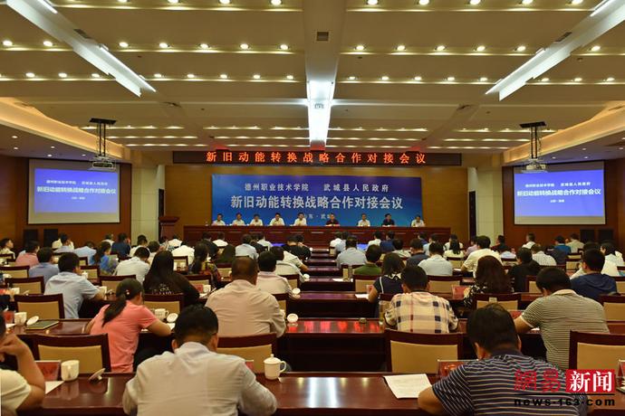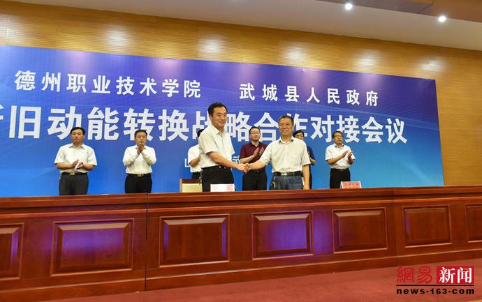 德州职业技术学院与武城县人民政府签订新旧动能转换战略合作对接会议由县委副书记、县长朱恩鹤主持,武城县委书记张磊致辞,学校党委书记樊兆杰讲话,中椒英潮辣业发展有限公司谭英潮发言,德州职业技术学院学生演示了刚刚获得全国创新创业亚军的虎帮辣椒酱品牌策划项目,参赛指导教师甄冰对今后如何进行校企合作、产教融合做了分析说明,最后陈章侠副院长和武城县人民政府签订新旧动能转换战略合作协议。