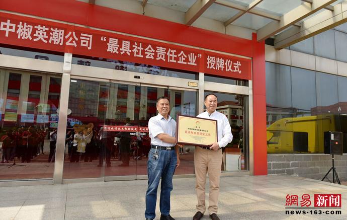 陈章侠副院长为中椒英潮辣业发展有限公司颁发教育部授予的“最具社会责任企业奖”牌匾。