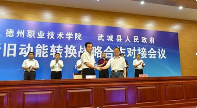 为贯彻落实省市关于推进新旧动能转换工作部署,服务区域高质量发展,5月19日,德州职业技术学院与武城县人民政府举行合作对接会议,签订了新旧动能转换战略合作协议。德州职业技术学院党委书记樊兆杰、副院长陈章侠,武城县委书记张磊,县委副书记、县长朱恩鹤,县有关部门、乡镇、企业负责同志,学院专业技术人员参加对接会议。樊兆杰介绍了学院改革发展情况和服务区域发展等方面取得成绩,并表示,作为全市唯一国办高职院校,学院将进一步发挥学科、人才、科研、技术技能培训、创新创业教育等优势,深入推进与武城产业发展的深度融合,全方位服务企业新旧动能转换,不断开创资源共享、互利共赢的新局面。