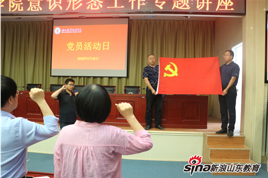 本次党员活动日共有三项议程:首先180余名党员起立唱国歌;随后全体党员重温入党誓词,面对党旗,举起右手庄严宣誓,对党和人民做出庄严承诺;接下来张维杰同志从什么是意识形态、加强意识形态工作的重要性、高校意识形态工作面临的挑战、如何做好当前意识形态工作四个方面为全体党员做了一场题为《浅谈重视和加强意识形态工作》专题报告。