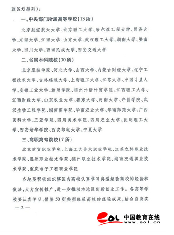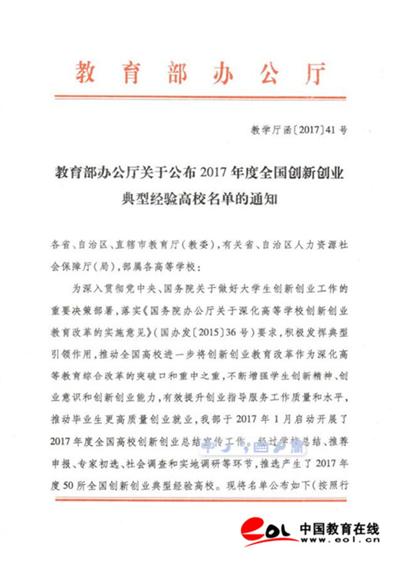 据悉,“全国创新创业典型经验高校”评选工作由教育部全面组织,面向全国所有高校开展,设有学校总结、推荐申报、专家初选、社会调查和实地调研等环节,最终评选出具有创新创业典型经验、在创新创业教育方面具备典型示范作用的50所高校。2017年度评选产生的全国高校创新创业50强,包含13所中央部门所属高等学校、30所省属本科院校、7所高职高专院校。