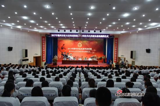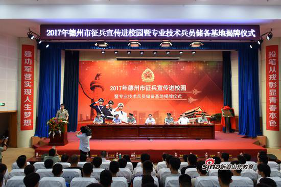 6月20日上午,德州市征兵宣传进校园暨山东省专业技术兵员储备基地揭牌仪式在德州职院学术报告厅隆重举行。德州市人民政府副市长董绍辉,德州军分区司令员张俊杰、政委刘晓明、参谋长曹光,德州职业技术学院党委书记樊兆杰、院长张同光及德州市征兵领导小组成员单位有关领导出席,启动仪式由军分区副政委支家斌主持。学校有关部门负责人及学生代表近500余人参加启动仪式。