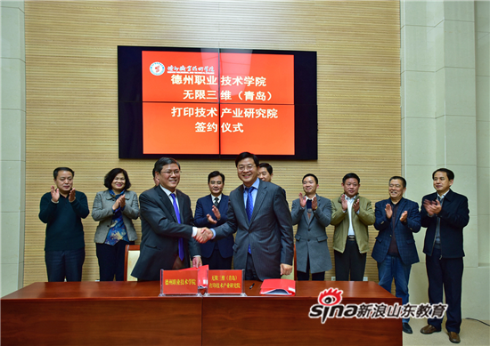 1月9日,德州职业技术学院与无限三维打印技术产业研究院举行签约仪式,共建3D打印学院。省教育厅职教处处长梁斌言,中国3D打印技术联盟执行理事长、无限三维科技产业集团董事长罗军,院长张同光,副院长陈章侠、李建华,经济技术开发区党工委书记鄂宏达,德州市教育局副局长王学东等领导出席仪式,学校相关部门负责人参加。