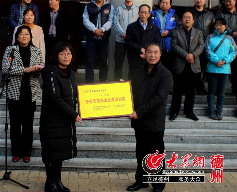 德州市中心血站党支部书记、站长王明才,站长助理张晓云分别为该校先进集体、先进个人代表颁奖。