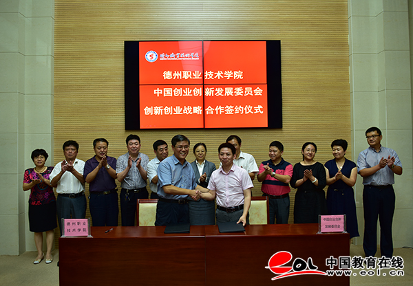 8月23日下午,德州职业技术学院与中国创业创新发展委员会战略合作协议签字仪式在学校润德楼八楼视频会议室举行。中国创业创新发展委员会执行主任李潮平、副主任肖雅静、导师团团长路军、基础教育培训中心主任谢强、投融资管理中心副主任张青、秦皇岛教育培训中心执行主任韩思齐、德州职业技术学院党委书记郭宝庆、院长张同光、副院长李建华、院党委委员办公室主任郭士武 、院长助理魏滨训、教务处处长殷淑英、招生就业指导处处长冀康建及学生处、各系部主要负责人参加签字仪式。