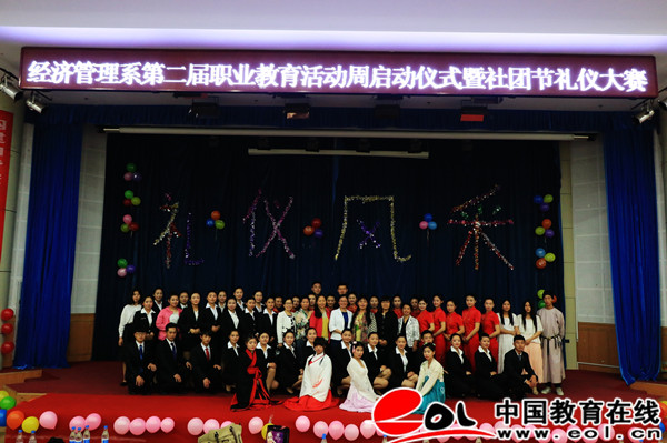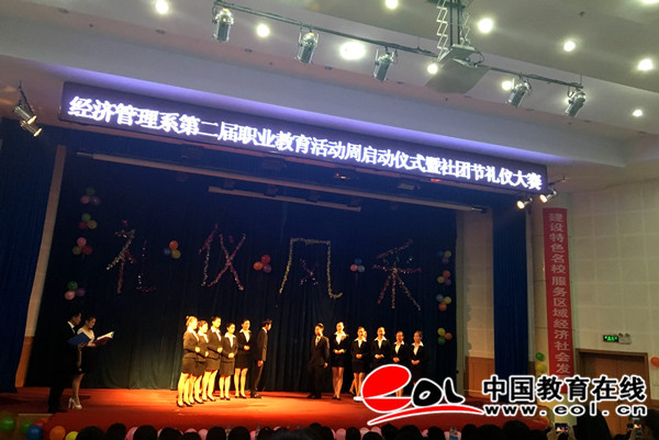 中国教育在线讯 为了巩固德州职业技术学院文明建设,普及礼仪知识,达到“以赛促学”的目的,5月10日下午,由经济管理系承办的德职院2016年社团节礼仪风采大赛在学校学术报告厅举行。出席此次大赛的有学院团委书记田树军、学生处副处长范轶、经济管理系书记崔建强以及学生管理人员。大赛评委组由5名专业老师组成。