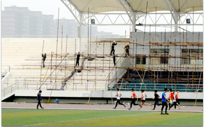 4月12日,在德州职业技术学院足球场,工作人员正在拆除主席台上的脚手架。 4月16日至5月29日,中国城市足球联赛德州赛区比赛将在该院举行,目前已对足球场地的草坪进行了修剪,对主席台钢膜结构进行了除锈粉刷、水电线路进行了检查维修,各项准备工作基本就绪。