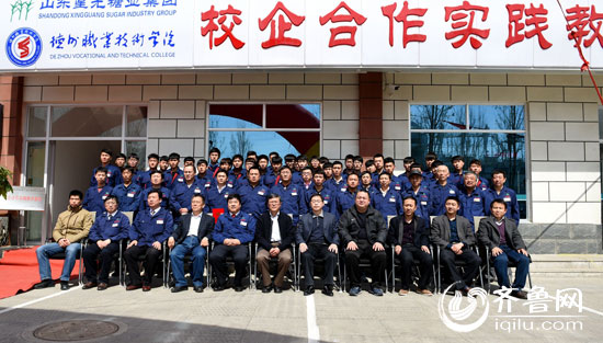 德州齐鲁网3月30日讯(记者 周树茂 通讯员 王新 闫鲁超 王晓平)3月29日,德州职业技术学院与山东星光糖业集团举行的机电一体化“现代学徒制”拜师典礼在山东星光糖业集团的校企合作实践教学基地隆重举行,典礼由星光集团副总经理潘永胜主持,德州职院院长张同光、副院长陈章侠、乐陵市党组成员李伟、星光集团董事长曹永兴、德州职院电气系党总支书记刘宏杰及乐陵市组织部、教育局、科技局等相关部门领导出席了仪式。