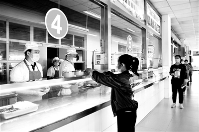 排队打饭的学生自觉保持安全距离
