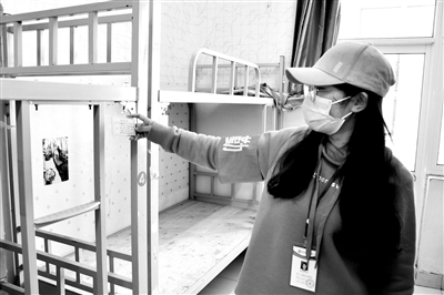 辅导员万欣在学生宿舍查看床位信息牌。为了降低人员密度,该校将8人间设置成4人间