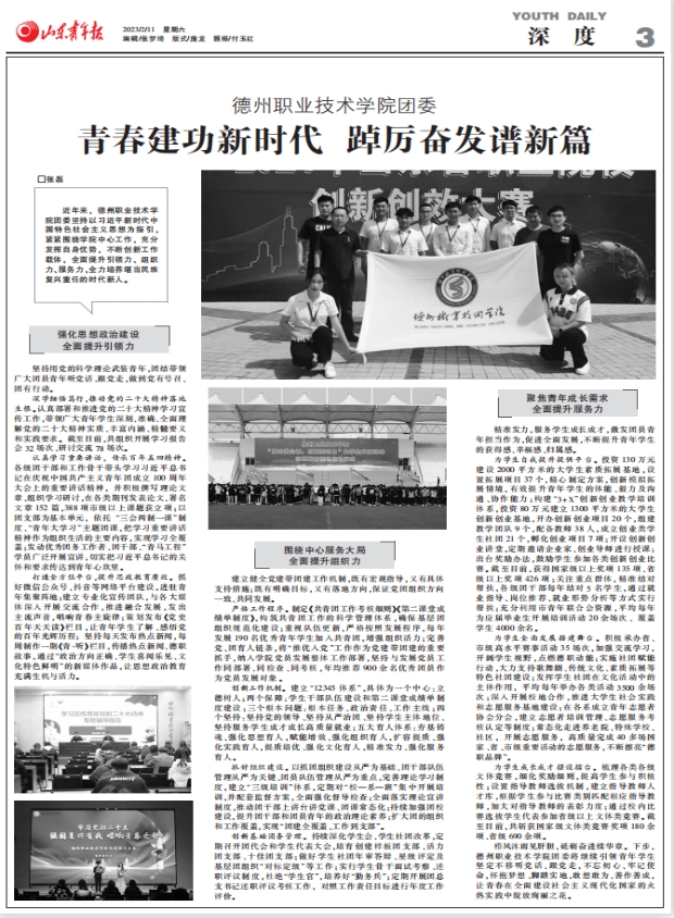 2月11日,《山东青年报》整版刊登报道《德州职业技术学院团委:青春建功新时代,踔厉奋发谱新篇》深度文章,详细介绍德州职业技术学院在培育青年学生成长成才教育工作中的典型经验做法。