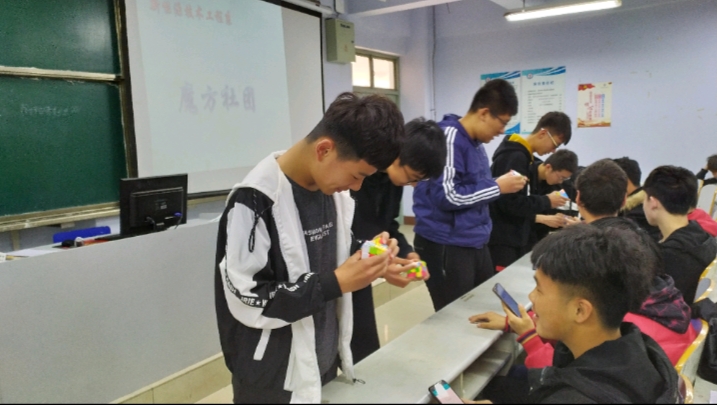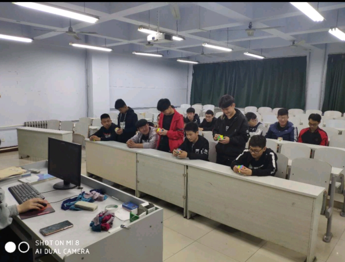 本社团自成立起一直致力于推广魔方,在我们的一起带动下,学校里掀起了一阵魔方热。在结束了白天的学业后,晚自习同学们一起互相学习与探讨玩魔方的各种新的看法。在这里我们将寻找我们最开始玩魔方的初心。