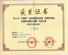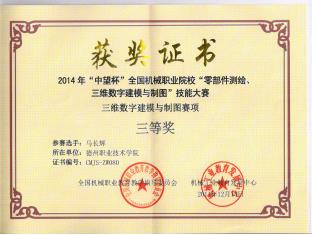 本次大赛在镇江高等职业技术学校举行,设教师组“三维数字建模与制图”、学生组“零部件测绘”两个项目,共有147名教师和207名学生参赛。我院机械工程系派出两位教师,三位学生参加比赛。经过激烈的角逐,陈俊波老师在147位参赛教师中脱颖而出,获得三维数字建模与制图赛二等奖,并获得“应用能手”称号,马长辉老师获得三维数字建模与制图赛三等奖;学生王齐、王超、谷晓峰分别获得零部件测绘赛三等奖。