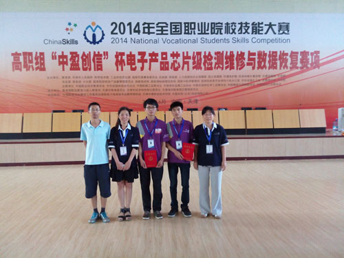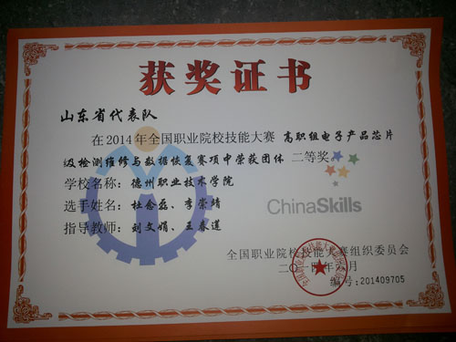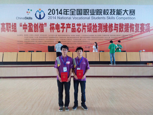 6月25日,2014年全国职业院校技能大赛高职组“中盈创信”杯电子产品芯片级检测维修与数据恢复赛项在天津中德职业技术学院举行。来自全国20个省、市、自治区53所院校的代表队的共106名选手参加比赛。我院计算机信息技术工程系2013级高职物联网应用技术专业学生杜念磊、李崇靖参赛,比赛中两名选手沉着应战,表现突出,体现出良好的职业素养,获得全国团体二等奖。