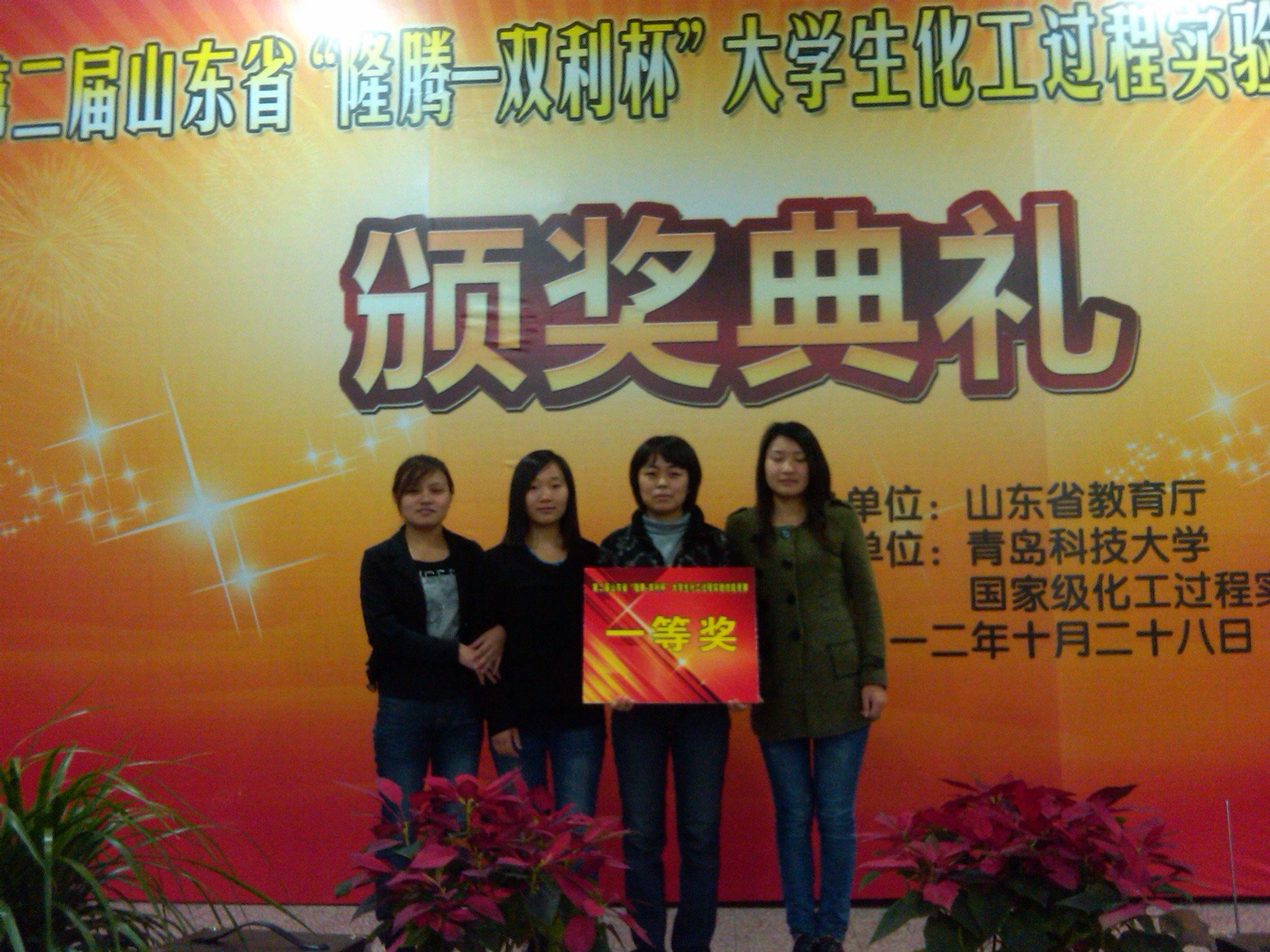 第二届山东省“隆腾-双利杯”大学生化工过程实验技能竞赛复赛于2012年10月在青岛科技大学举行。此项赛事由山东省教育厅主办,青岛科技大学国家化工过程实验教学中心承办,来自省内的多所院校参加比赛。我院化学轻工系应用化工技术专业学生董红香、贾秀秀、申巧燕组成参赛小组参加比赛,并荣获一等奖。德州职业技术学院荣获组织工作优秀奖。